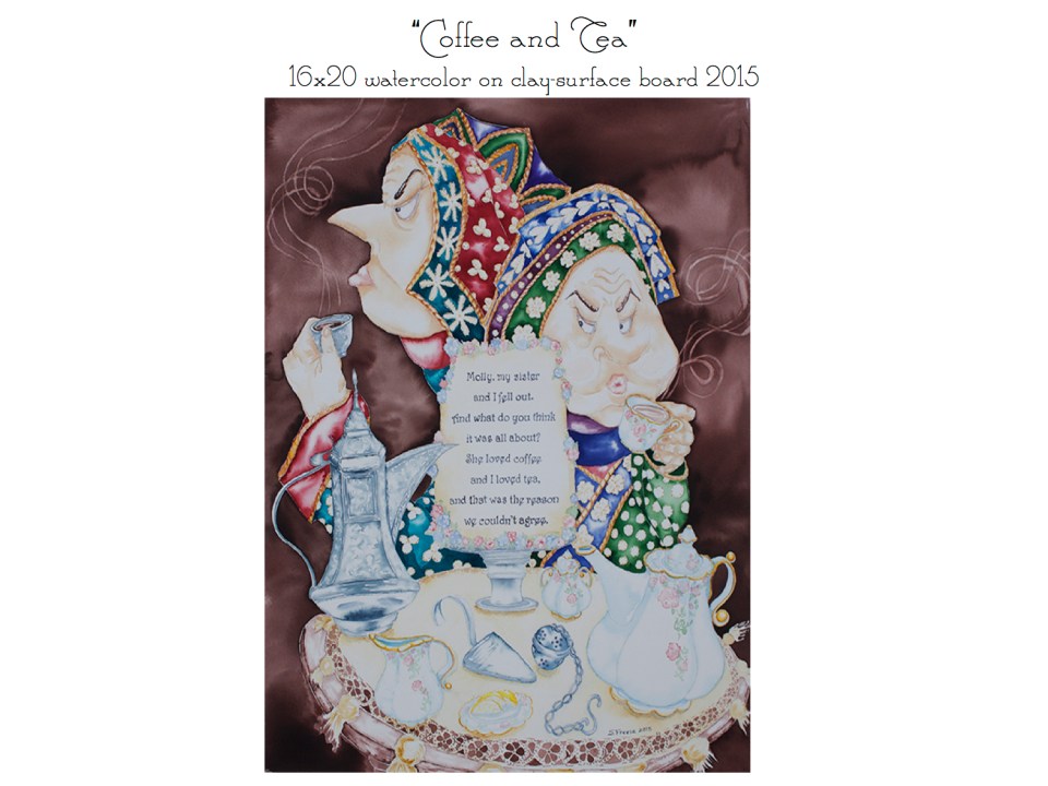 I spent the next morning collecting images of coffee mills and tea balls and scrumptious vanilla cakes. I looked up coffee-flowers and tea-flowers to “embroider” into the sisters’ layered scarves. I collected all the card-deck Queens—Hearts, Diamonds, Clubs, and Spades, just to see how their heads are dressed. I’ve drawn a thumbnail and some studies. Coffee and Tea is coming right along.